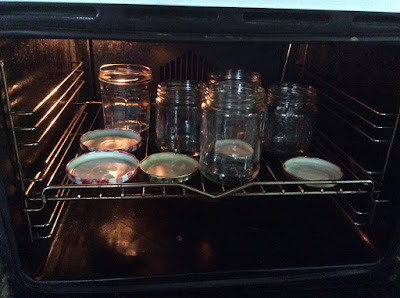 Wash about 5 jams jars in hot soapy water, rinse and dry with clean tea towel. Place in oven at 180 C and leave for 10 minutes to sterilise.