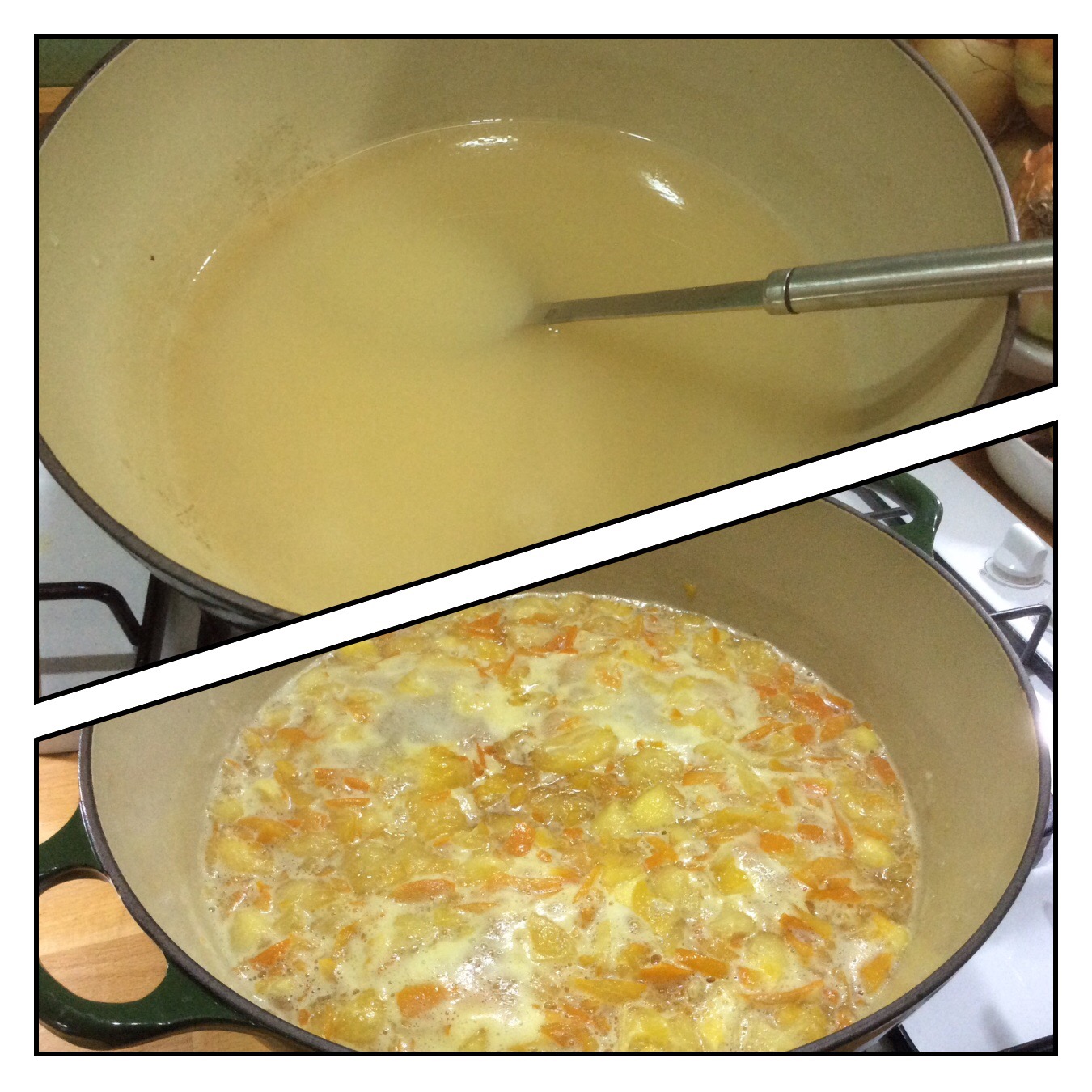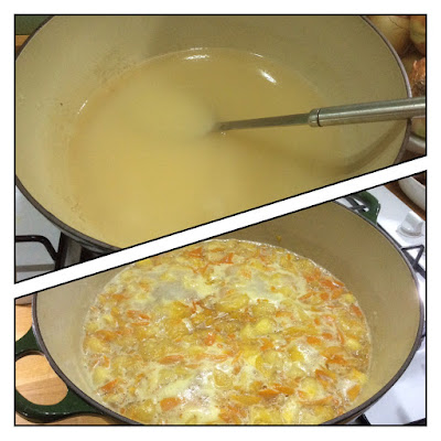 In a large pan place sugar and 600ml of fresh water. Bring to boil and allow to bubble until all the sugar has dissolved. Add the orange chunks, juice and chopped orange skin and boil briskly for about 25-30 mins.