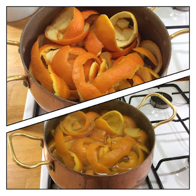 Using a sharp knife peel off the rinds of the oranges. Put in pan and cover with water. Boil until rind is tender ( about 90 minutes) and then drain and cut rind into small matchstick size pieces and put aside.