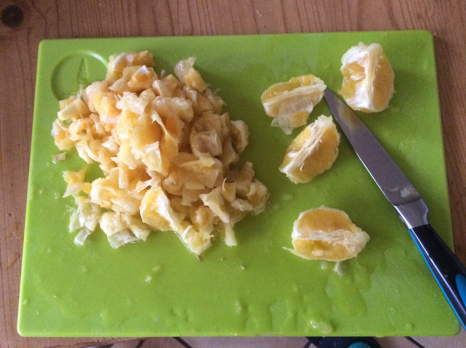 Chopping the rind is quite quick. The fiddliest bit is taking off the pith and removing the pips. A sharp knife certainly speeds things up.